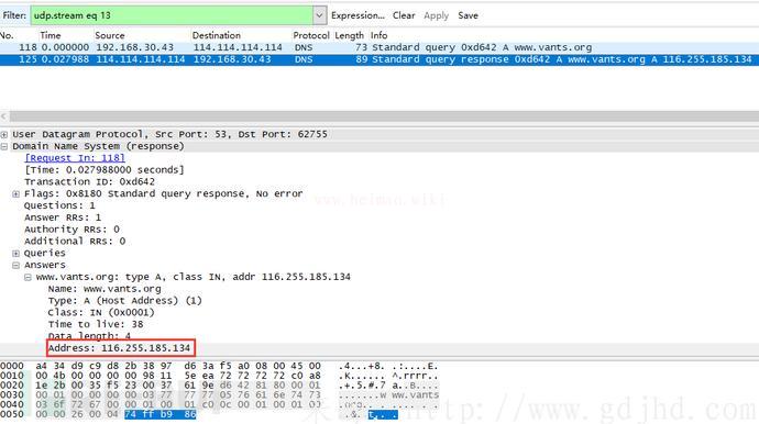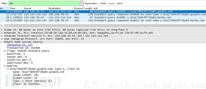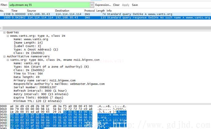 ,人們討論一下DNS的分析步驟,手機客戶端開展了一次DNS查尋,DNS服務器查詢之后回到一個結果“NOsuchnameAwwww.vants.org”,能夠 見到DNS服務器虛擬機查尋后,搜索不上那樣的結果。,