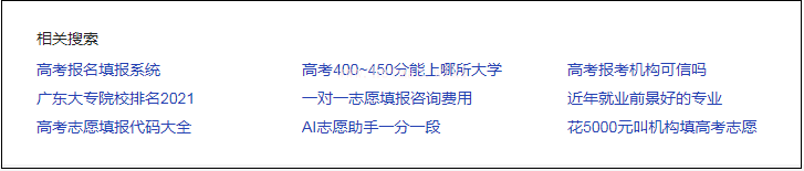 最后,當我們從多渠道挖掘不同的核心搜索需求之后,我們就需要進行有效的合并,去重,找尋到當下最為值得關注的一些關鍵詞,比如:時間、流程、入口、專業、一對一填報、400-450分能上哪所大學,而我們在做相關性頁面的時候,可以圍繞這些相關性內容,組織頁面結構。