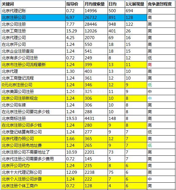 當然,如果你的預算還算可以,也可以適當的選擇藍色背景關鍵詞:北京注冊公司,相對其他高指導價格的關鍵詞,這個1元展現量相對比較高。