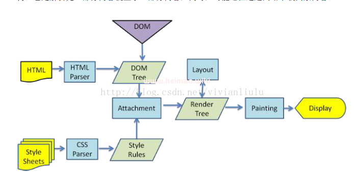 瀏覽器在收到HTML,CSS,JS文件后,它是如何把頁面呈現(xiàn)到屏幕上的?下圖對(duì)應(yīng)的就是WebKit(一個(gè)開源的瀏覽器引擎)渲染的過程。