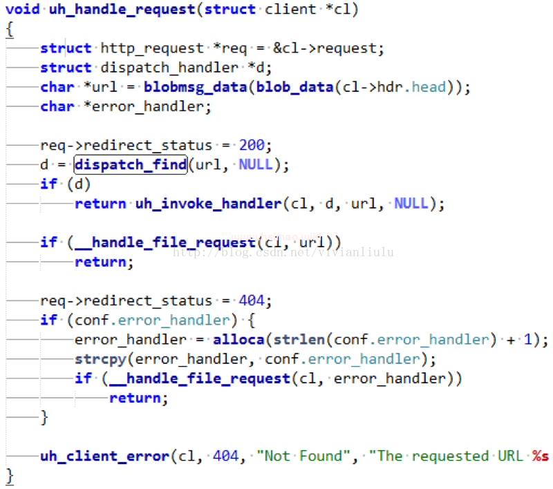 Uhttpd在完成CLIENT_STATE_HEADER處理的時(shí)候會(huì)調(diào)用uh_handle_request(cl)函數(shù)來處理客戶端的請(qǐng)求。