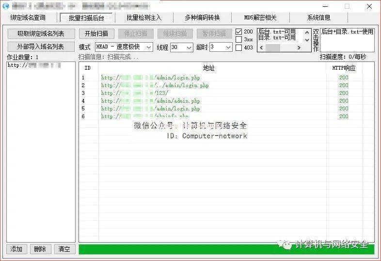 目錄掃描工具主要針對網站目錄或者后臺管理地址進行暴力猜解的工具。目錄掃描工具有一個共同的特性:目錄字典或者后臺管理字典越強大,其掃描出的目錄或者后臺管理地址的數目就越多、越準確。以前的目錄掃描工具有啊D注入工具(目錄掃描模塊)等,現在的目錄掃描工具有御劍、DirBuster及wwwscan等。