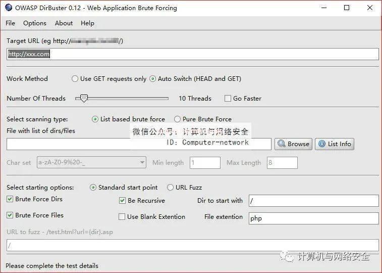 DirBuster是OWASP(Open Web Application Security Project)開發的一款專門用于探測Web服務器目錄及隱藏文件的,功能十分強大的工具。DirBuster最擅長目錄的暴力猜解,因此,DirBuster一般都會發現一些目錄瀏覽、目錄遍歷及目錄穿越等漏洞,甚至還會發現一些后臺管理地址等。DirBuster工具如圖2所示。
