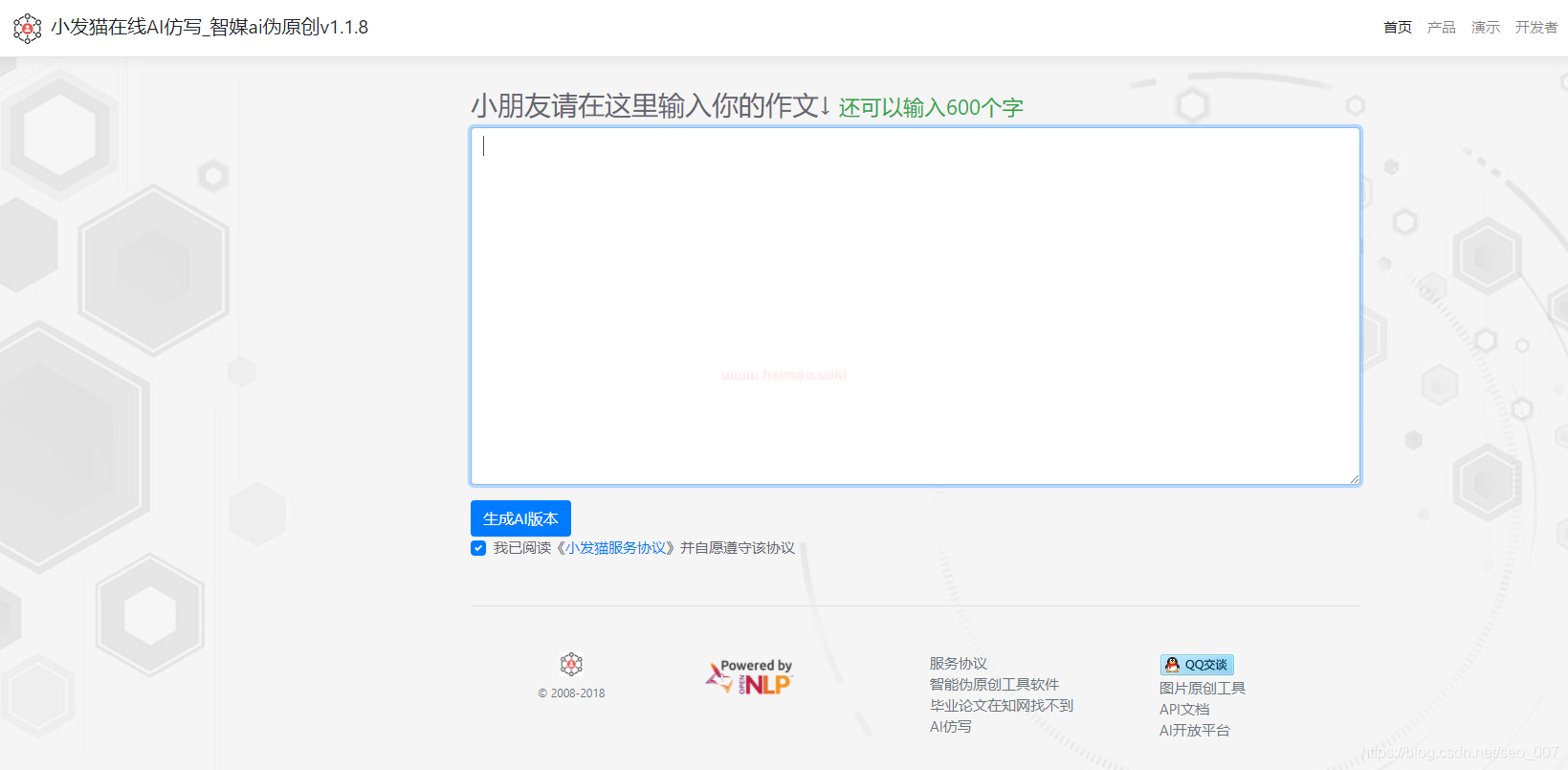 小發(fā)貓是一款基于AI技術(shù)的智能化內(nèi)容創(chuàng)作平臺(tái)。采用NLP中文詞庫和語言模型人工智能對(duì)原創(chuàng)文章進(jìn)行修改,生成偽原創(chuàng)。