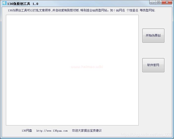 136偽原創(chuàng)工具是一款由136網(wǎng)盤官方開發(fā)的的綠色免費(fèi)專業(yè)的偽原創(chuàng)工具。成都seo覺得136偽原創(chuàng)工具軟件功能強(qiáng)大,該工具僅適用各類QQ類型網(wǎng)站,如QQ網(wǎng)名、QQ簽名、游戲名字、QQ分組等網(wǎng)站,專門針對(duì)百度、搜狗、360等大型搜索引擎收錄設(shè)計(jì)。