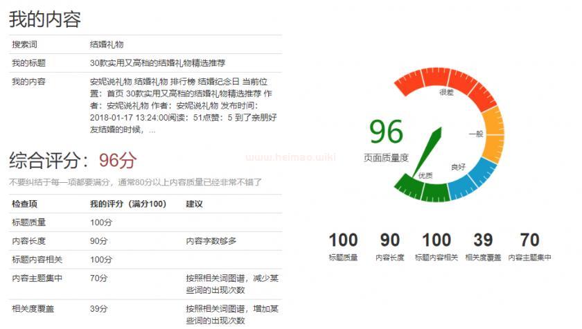 拿到以后,做“結婚禮物”這個詞,指數一直在300左右,通過摩天樓內容工具重構首頁,完善關鍵詞布局,內容質量綜合評分達到了96分: