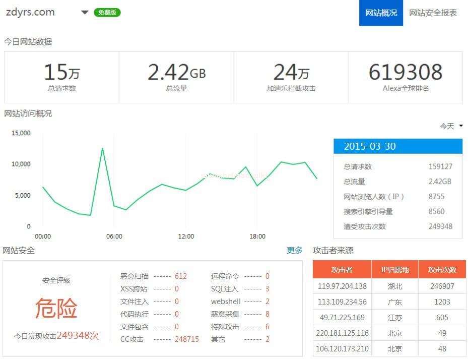 3、CDN防護:加速樂、云盾(不推薦百度云加速,1000次CC攻擊便會崩潰,360網站衛士因審核較嚴未通過不評價)