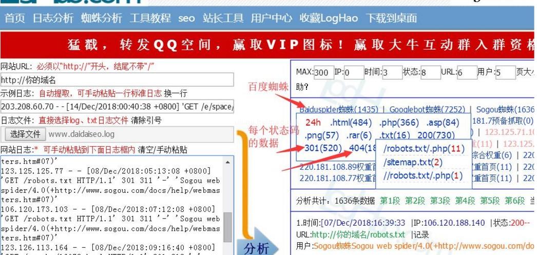 當你把蜘蛛日志下載到本地的時候,你需要把日志放入軟件去分析,我們常用到的軟件有兩種,第一種是在線的“www。loghao。com”日志分析工具,第二種是需要下載“光年日志分析軟件”這兩款分析日志工具非常不錯,通常我們都結合使用,效果非常好!