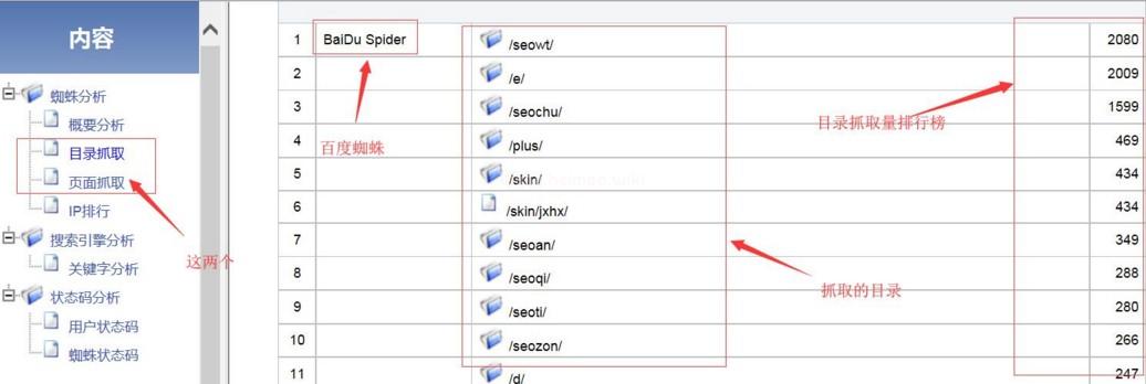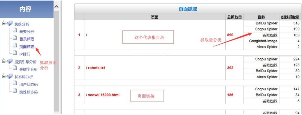 鏈接與目錄,我們通過上圖的“蜘蛛抓取目錄”可以分析出來,比如“/robots.txt”就是我們的“域名/robots.txt”我們通過光年日志進行分析比較直觀一些!我們可以通過點擊光年日志左邊的“目錄抓取”、“頁面抓取”來進行查看分析!