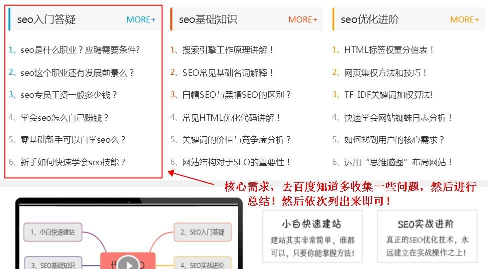 我們把前幾頁問題全部收集到一個文檔中做分析,我們會發現針對SEO基礎這邊,很多人都是零基礎小白,對seo技術一點都不了解,我們想一下,一個都不知道SEO是什么的小白,直接學基礎,他真能學會么?其實SEO技能是依附在網站建設上面的技術,連網站建站都不會,就算學習了SEO基礎,他能學會么,很顯然,直接布局SEO基礎知識,絕對是不妥當的,對用戶幫助不是很大。