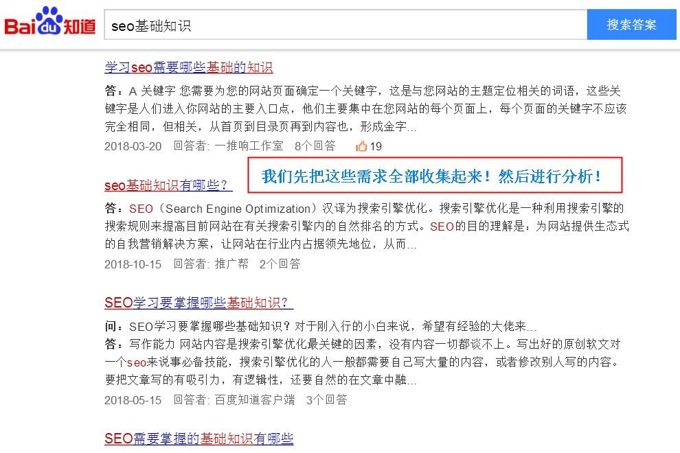 這個工具就是“百度知道”,幾乎用戶所有的問題都會在這里面進行提問,所以我們是可以在問答需求中直接分析出用戶核心需求的!這大大方便了我們關鍵詞核心需求分析工作,我們用“SEO基礎知識”這個關鍵詞來舉例!