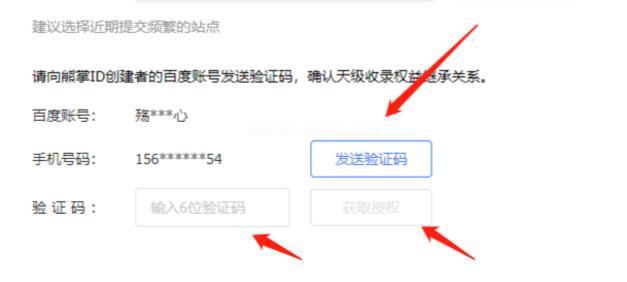 按下確認按鈕后將展開百度賬號向熊掌ID創建者發送驗證碼,確認天級收錄權益繼承關系。簡而言之,就是給你這個熊掌號發短信驗證碼確認你是否是管理員(這里怕是難倒了不少人),據冬鏡了解很多站長的熊掌號都是買來的,也就意味著收不到驗證碼),驗證通過(點擊獲取授權)后,綁定成功(成功綁定)。
