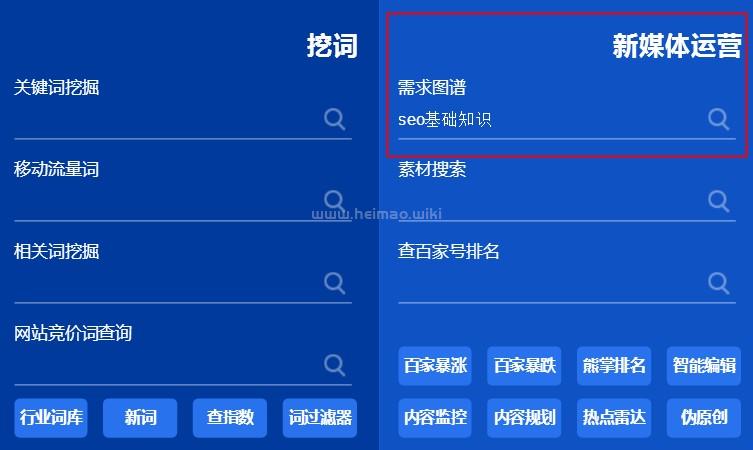 我們進入5118的網站,在第三欄“新媒體運營”下面有一個需求圖譜,我們搜索“SEO基礎知識”。