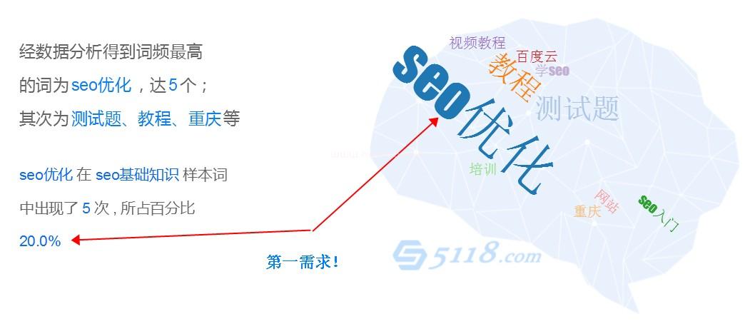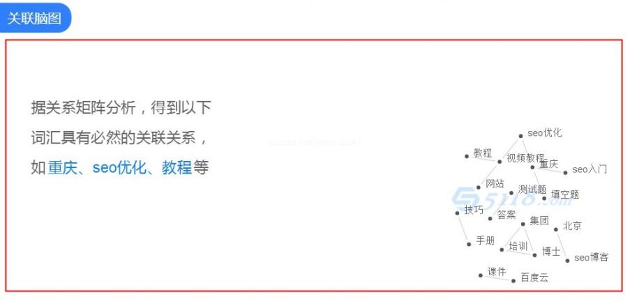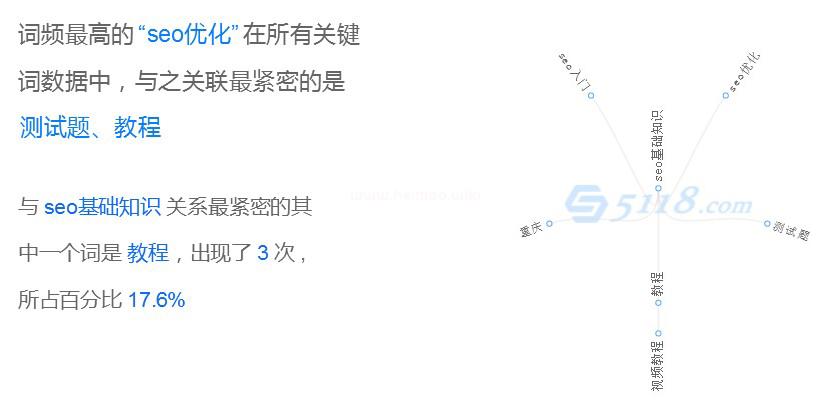 我們往下看是詞頻放射圖,是根據用戶需求所進行放射排序的“SEO基礎知識”圍繞的幾個詞,也就是我們需要定義欄目的核心詞了,如果我們想重點優化“SEO基礎知識”就必須把這幾個重點分布到我們網站中!