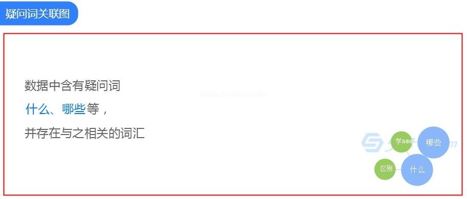 疑問詞關聯圖,就是針對這個主詞而言,有哪些疑問需求詞,這些疑問詞,都是通過用戶數據分析出來的,所以有更高的點擊率!比如“區別”、“什么”、“那些”等等,有了這類疑問詞,我們在寫標題的時候,經常用就是了,比如“外鏈與內鏈的區別”這類!