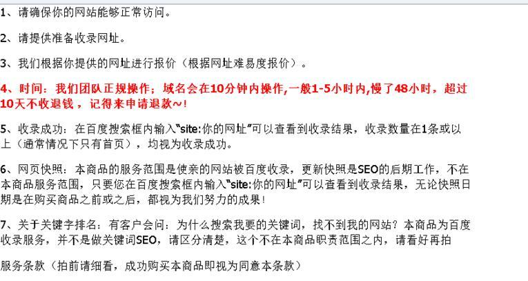 首先可以肯定的告訴你,一個新站建立以后,10分鐘內收錄是有一定難度的,光提交到抓取審核收錄這個流程實際上就不只是10分鐘了,就算有良好的蜘蛛池給你新站引蜘蛛10分鐘收錄也是有難度的。所以說商業也做不到這一點的,那么咱們點開他們的寶貝詳情來看看!有7個條款,其中第四條被標注的特別明顯。