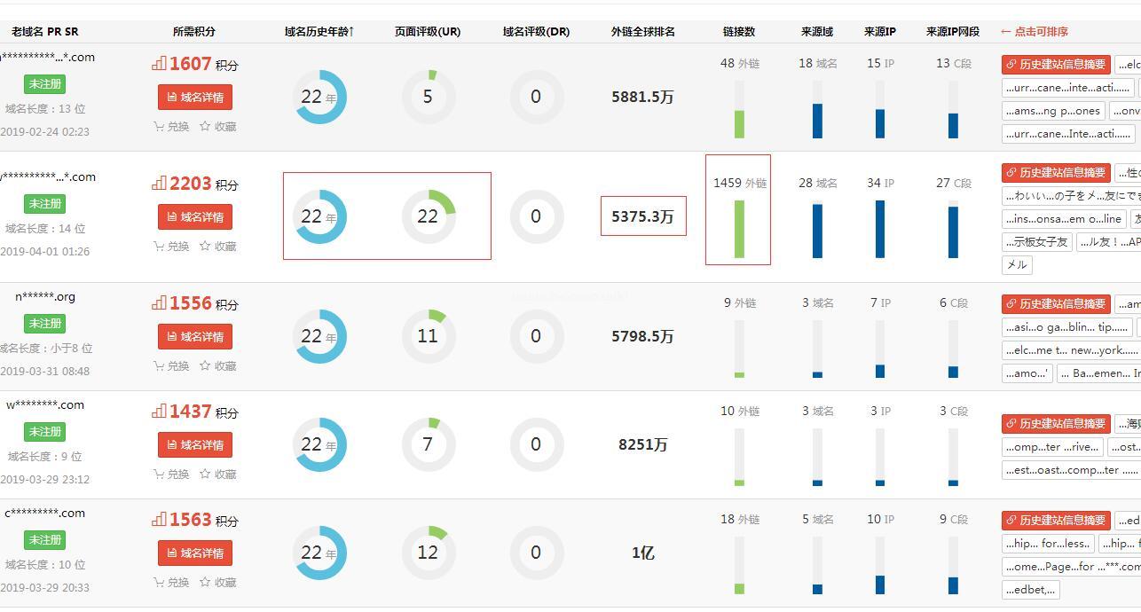 然后觀察他的全球排名、外鏈數,進行查看和選取,這邊注意,全球排名越靠前,域名年齡越久、域名外鏈越多的域名越優先,可以根據這種域名,收集一些!