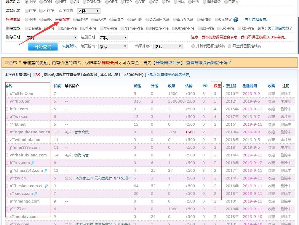 建議大家辦理一個高級會員,一天/10元即可,查詢一天就可以了,可以看到大量高權重的域名。