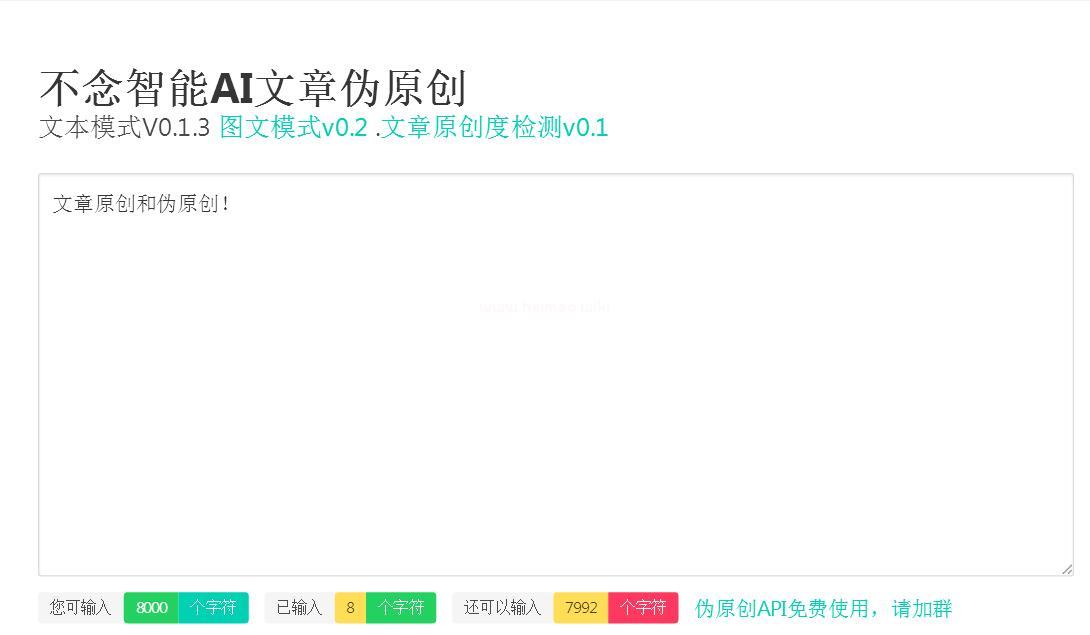 現(xiàn)在市面上很多Ai偽原創(chuàng)都是收費(fèi)的,比如5118的偽原創(chuàng)一年是600多元,很貴的價(jià)格,那有沒有質(zhì)量好的且免費(fèi)的,當(dāng)然你有了,大家打開這個(gè)網(wǎng)址“www.bunian.cn/ai”永久免費(fèi)的,而且這款A(yù)i偽原創(chuàng)是非常強(qiáng)大的,使用非常簡單,輸入文章,點(diǎn)擊偽原創(chuàng)即可,另外大家要嚴(yán)格按照我們上面說的來操作,不要偷懶,Ai偽原創(chuàng)一定要跟人工配合起來才能打造高質(zhì)量文章的。