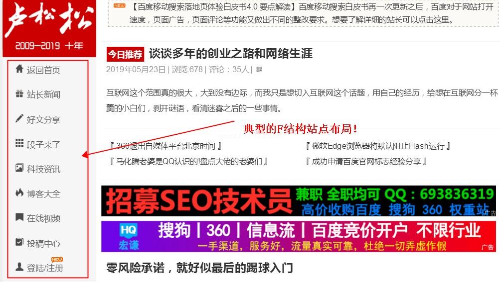 盧松松博客,就屬于F型結構,欄目全部布局在左邊,整體像一個F型的網站結構!