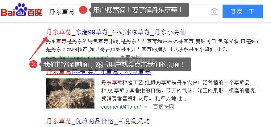 但是用戶既然搜索“丹東草莓”,他必然有一個需求,或者想做丹東草莓的生意,或者聽朋友說丹東草莓好吃,自己想了解下丹東草莓,看哪里買的正宗對吧,這個時候,如果搜索結果的網頁中,有一個廣告語“想買丹東草莓,聯系XXX”感興趣的自然就會聯系,進而產生了成交對吧,大家可否知道,百度搜索引擎可是面對全國的人群搜索,這就意味著,全國的人都可能搜索到你的網站,跟你產生成交對吧!