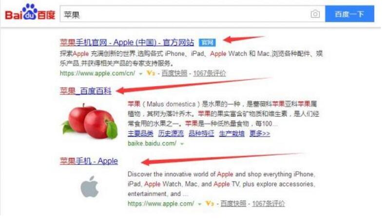 關于這個問題,筆者查閱了一些資料,仍然不能完全明了。舉個例子,打開百度,搜索“蘋果”,搜索結果如圖: