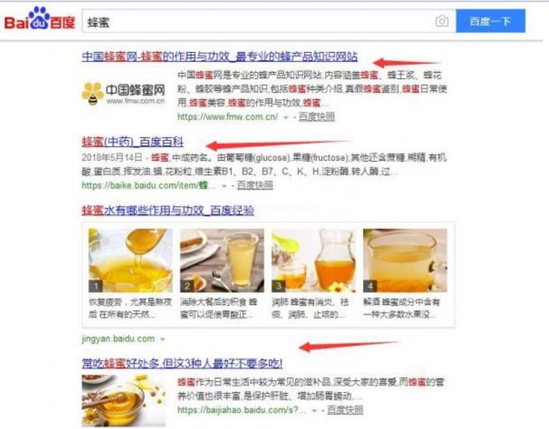 筆者認為,在做SEO的時候,從搜索結果來判斷網站的整體優化方向,判斷準了,可以大大提高優 化效率。再舉一個例子,搜索:“蜂蜜”,如圖: