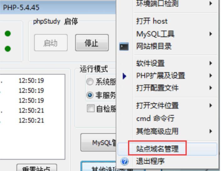2.我們啟動(dòng)phpStudy后,單擊【其他選項(xiàng)菜單】選擇【站點(diǎn)域名管理】,如圖:
