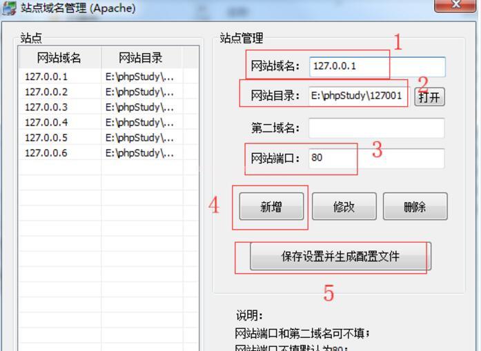 3.然后開始增加本地網(wǎng)站目錄,依次填寫【網(wǎng)站域名】-【網(wǎng)站目錄】-【網(wǎng)站端口】-【新增】-【保存設(shè)置并生成配置文件】這一步非常重要,下面是三個(gè)基本步驟,大家可以參考圖片中的設(shè)置!