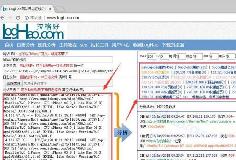 分析網站日志,一般我們都需要用軟件進行分析,這邊風雪推薦大家一個在線免費的蜘蛛日志分析工具“loghao.com”大家訪問后,可以把自己的蜘蛛日志進行上傳,就可以進行分析了!