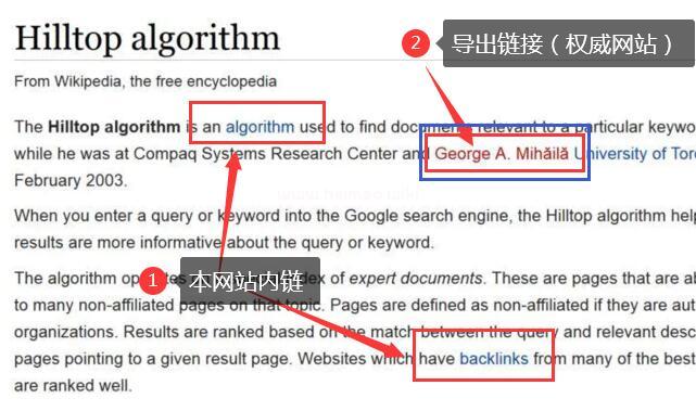 網站頁面內容中鏈接到權威網站可以增加你頁面的權威性,除了著名的企鵝算法和蜂鳥算法,還有一個重要的谷歌算法更新叫做Hilltop。 Hilltop本質上是一個頁面SEO信號方式,告訴谷歌這個頁面是否是一個信息中心。