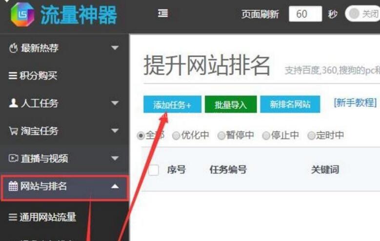 2,登錄會員,選擇“網站與排名”--“網站排名提升”--“添加任務”進入提升網站相關頁面!