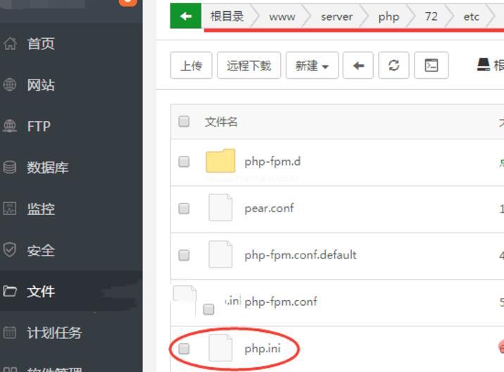 登錄寶塔Linux面板》文件》點(diǎn)擊頂端的“根目錄”》www》server》php》72(本機(jī)安裝的是PHP7.2,所以是72,這個數(shù)字關(guān)鍵是看你安裝的是什么版本PHP就是什么數(shù)字)》etc,在這里一般就能找到php.ini文件。具體如下圖的紅框位置: