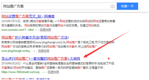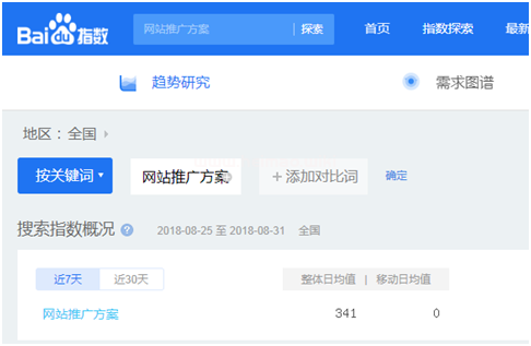 比如小編做了一個“網站推廣方案”的詞,可以看到這詞在百度首頁,排名算是比較不錯了,咱們打開百度指數查詢。