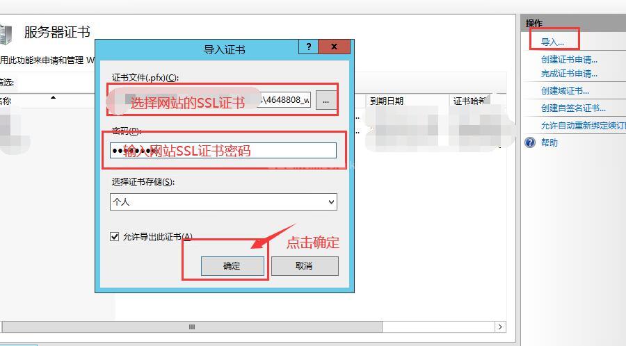 先單擊選擇左邊的導入,彈出的是網站服務器SSL證書導入界面,如上圖所示,證書文件方框內選擇網站的SSL證書,下方填入網站的SSL證書的密碼,點擊確定,就完成了網站SSL證書的導入。
