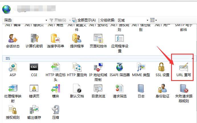 1、找到站點的“URL 重寫”功能,如果安裝的是英文版IIS8.0的,那么名稱應該是【Url rewrite】,如下圖所示: