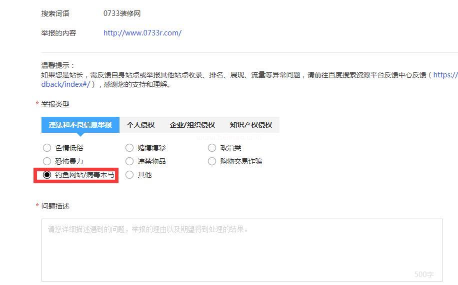 2、如何告訴百度搜索引擎已把非法病毒代碼刪除了呢?下面截圖來給大家詳細講解,下面以0733裝修網為例給大家講講。