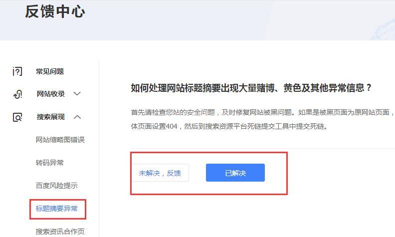 打開“百度站長平臺”的“百度搜索資源中心”,然后依次打開反饋中心-搜索展現-標題摘要異常,進行反饋,具體方法步驟可以參照以下截圖。