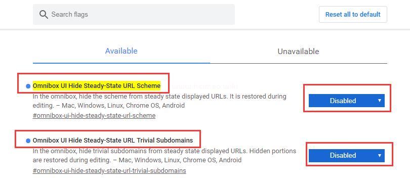 將Omnibox UI Hide Steady-State URL Trivial Subdomains,改成Disabled;
