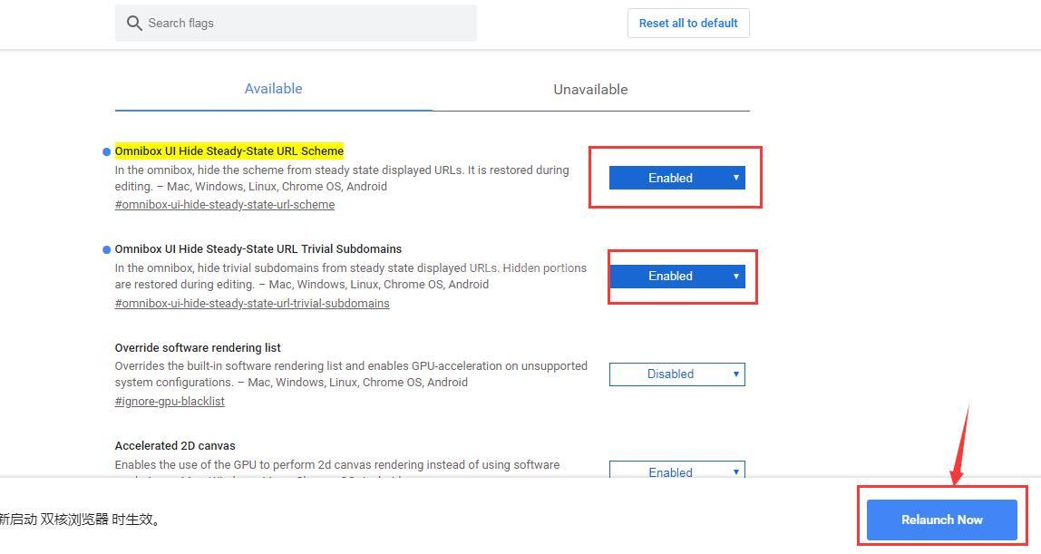 Chrome谷歌瀏覽器由于想要給用戶更簡潔的體驗,因此就把www、http或https協議給取消了,但對于站長們而言,有時候又想將www、http或https給顯示出來,以前的老版本谷歌瀏覽器只需要將Omnibox UI Hide Steady-State URL Trivial Subdomains更改為Disabled就可以了,而現在新版本谷歌瀏覽器就不行了,現在新版本谷歌瀏覽器需要更改以下兩個地方才行,如下面所示: