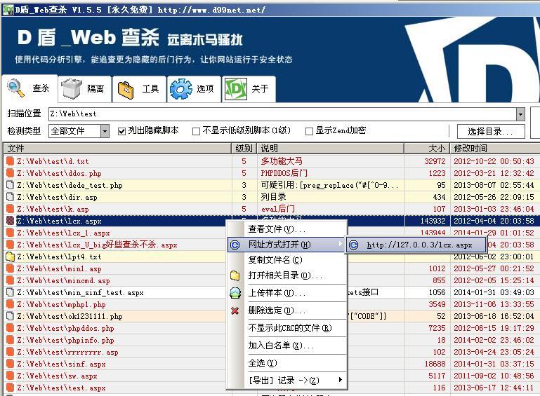 D盾_Web查殺可分析掃描更隱藏的WebShell后門程序行為,webshell查殺功能可對PHP按位取反(~)變量解讀,還加入了雙引號變量、數(shù)組變量的追查,能更好的識別惡意程序的后門樣式,軟件變量函數(shù)的內(nèi)部再轉換功能,可以還原利用變量函數(shù)更隱藏的后門方式,加強識別能力,加入對"foreach"傳值的新型后門加入了識別,加入讀取錯誤提示,防止后門設置權限禁止管理員訪問而無法獲知后門的存在!