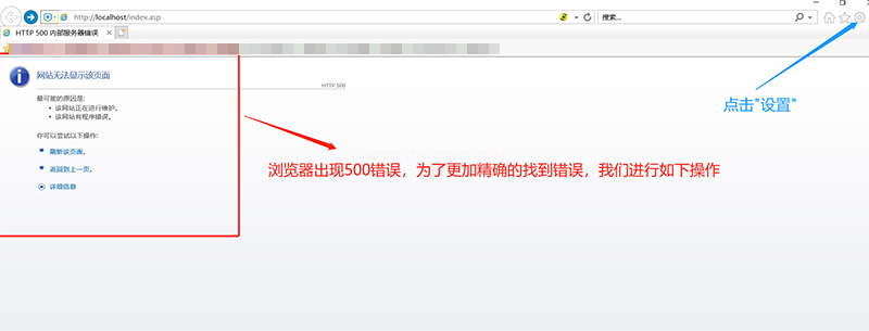 1、如果你打開的網(wǎng)頁顯示500錯誤,請點擊瀏覽器中的“設置”菜單選項,如下圖所示: