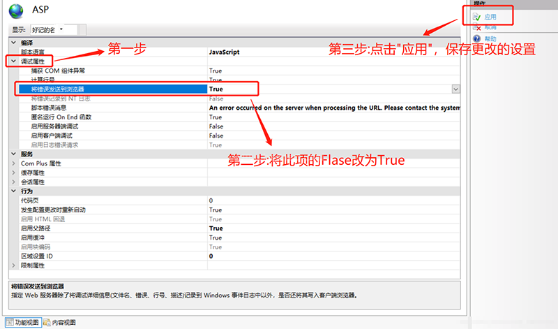 5、依據(jù)上圖所示,更改網(wǎng)站“ASP”選項里的設置,設置完成后點擊“應用”才會生效,如下圖所示: