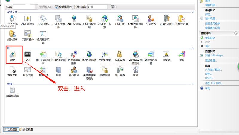 4、點擊IIS網(wǎng)站管理器中網(wǎng)站的“ASP”選項,如下圖所示:
