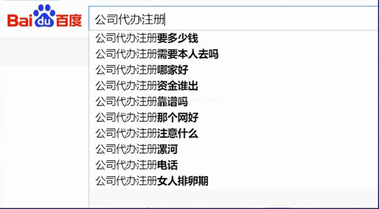 以上就是“公司代辦注冊(cè)”這個(gè)行業(yè)用戶的搜索需求,我們通過百度下拉框就能夠找出這個(gè)行業(yè)的用戶需求,比方說上圖中我們搜索“公司代辦注冊(cè)”下拉框中出現(xiàn)了“公司代辦注冊(cè)女人排卵期”,這個(gè)關(guān)鍵詞我們不能夠優(yōu)化的,因?yàn)榕c網(wǎng)站定位不相關(guān)。