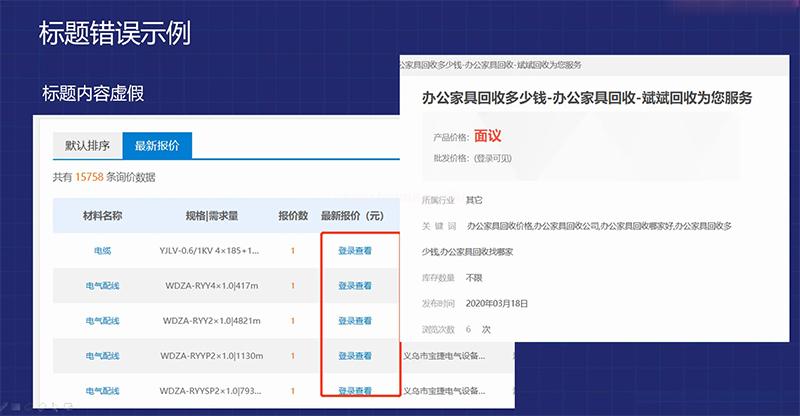 右圖標(biāo)題內(nèi)容中有“辦公家具回收多少錢”,點(diǎn)進(jìn)去產(chǎn)品價(jià)格卻是“面議”,批發(fā)價(jià)格需要“登錄可見”,這樣網(wǎng)頁內(nèi)容屬于虛假宣傳的范圍,因?yàn)槟銟?biāo)題內(nèi)容中寫了“多少錢”,卻沒有給用戶提供價(jià)格,直接導(dǎo)致的后果是網(wǎng)站跳出率極高。