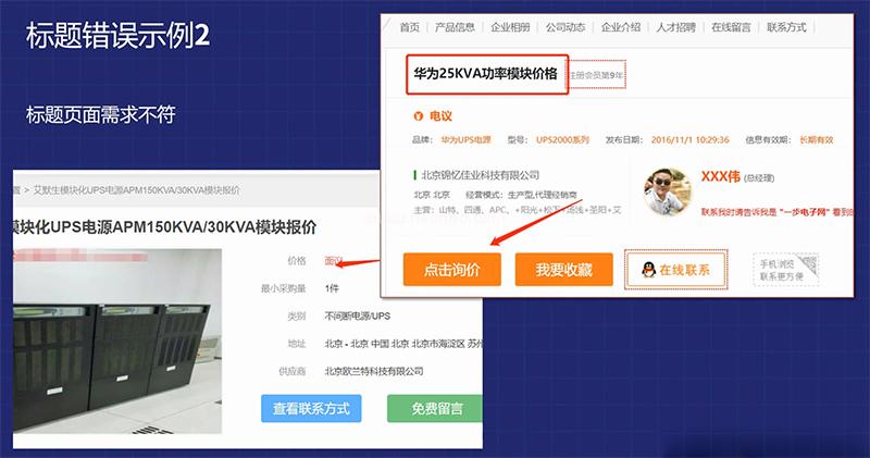 下圖中標(biāo)題內(nèi)容為“華為25KVA功率模塊價(jià)格”,點(diǎn)進(jìn)去卻需要“點(diǎn)擊詢價(jià)”和價(jià)格“面議”,這樣的網(wǎng)頁標(biāo)題內(nèi)容寫了提供價(jià)格,點(diǎn)擊進(jìn)去價(jià)格卻需要“面議”或“點(diǎn)擊詢價(jià)”,有的甚至需要加客服聯(lián)系方式詢價(jià)格,這種用戶會(huì)覺得太麻煩了,會(huì)直接關(guān)閉你的網(wǎng)頁走掉,如果我們公司產(chǎn)品價(jià)格允許公開,建議價(jià)格標(biāo)明就像是電商網(wǎng)站那樣,直接顯示產(chǎn)品的價(jià)格及優(yōu)惠,這樣的用戶體驗(yàn)度就非常好了。