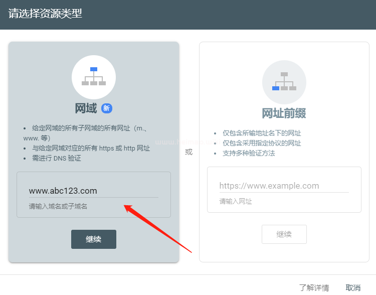 2、登錄谷歌站長平臺后,點(diǎn)擊左側(cè)的“添加資源”添加網(wǎng)站域名,網(wǎng)站驗(yàn)證類型為“網(wǎng)域”,可以綁定主域名也可以綁定子域名;
